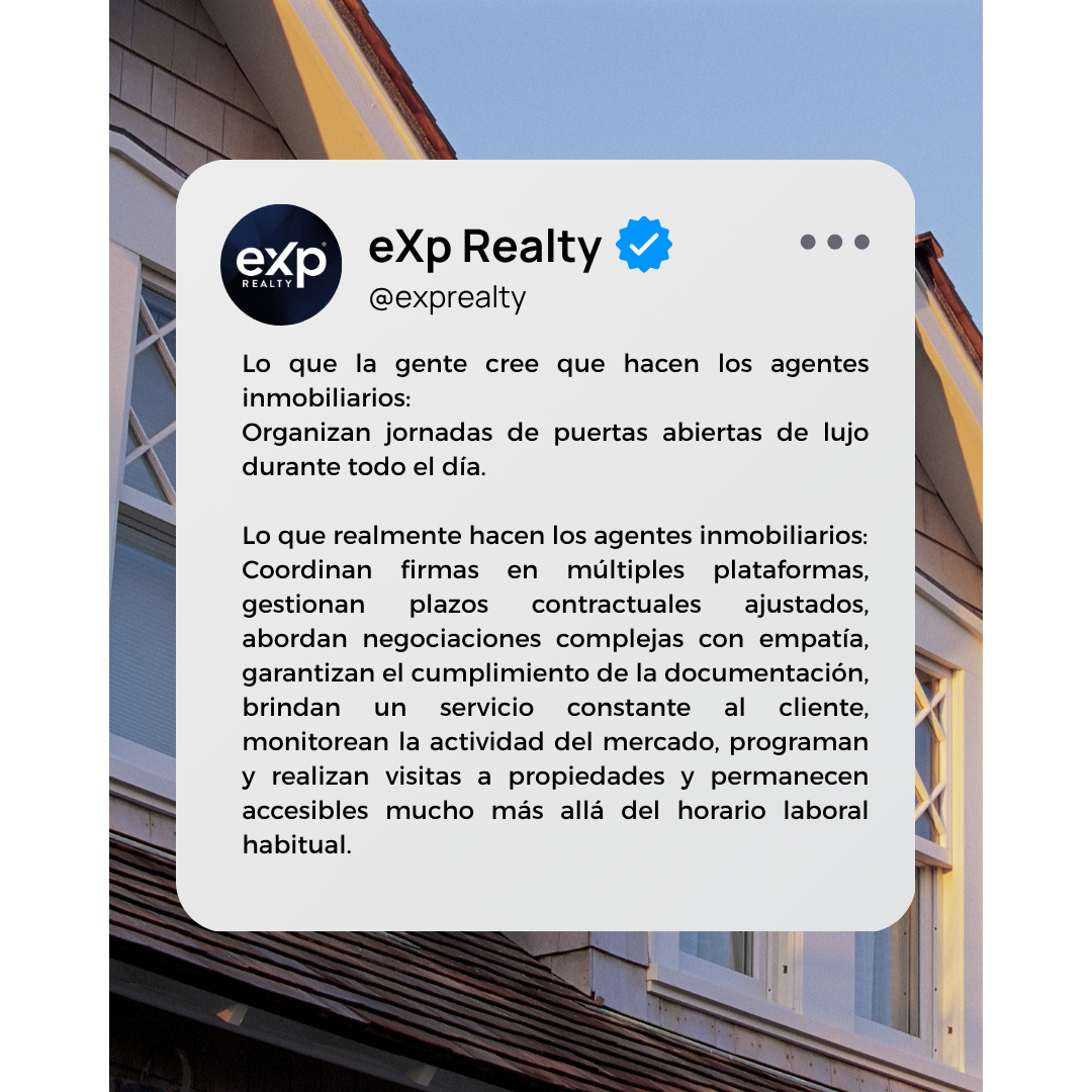 Mi experiencia me permite ofrecer un servicio transparente, cercano y altamente profesional. Trabajo con el respaldo de eXp Realty, la inmobiliaria de mayor crecimiento global, con presencia en más de 27 países y más de 89.000 agentes. Cada propiedad es un proyecto único, por eso diseño estrategias personalizadas que logran resultados.